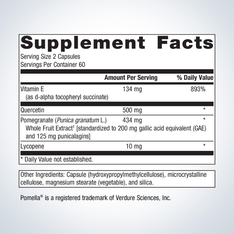 - Pomegranate Whole Fruit Extract – 434 mg: Standardized to 200 mg gallic acid equivalents (GAE) and 125 mg punicalagins to promote HDL activity and antioxidant defense.