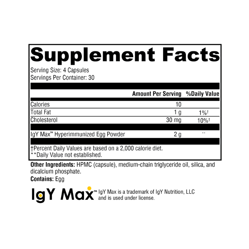 IG 26 DF is a dietary supplement formulated to support both immune and gut health. Each capsule contains immunoglobulins and immunoregulatory factors derived from hyperimmune chicken eggs, designed to promote intestinal and systemic health.