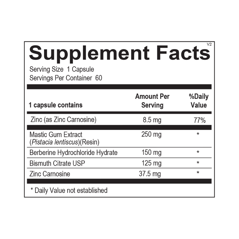 Bismuth Citrate: A naturally occurring mineral known for its soothing action on the gastric and mucosal lining, as well as its role in promoting normal bacterial growth.